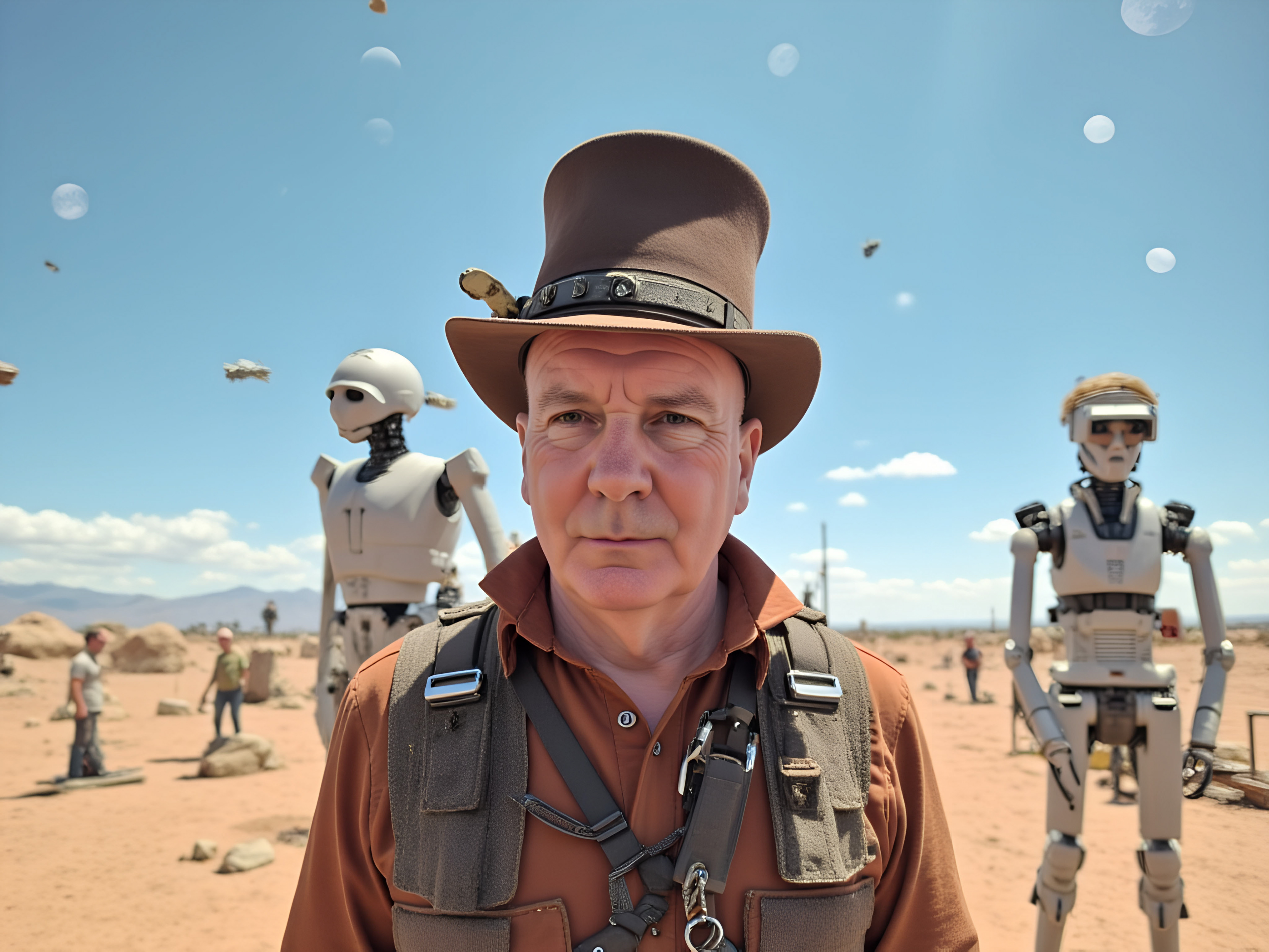 Me as a post-apocalyptic explorer, with robot bodyguards.