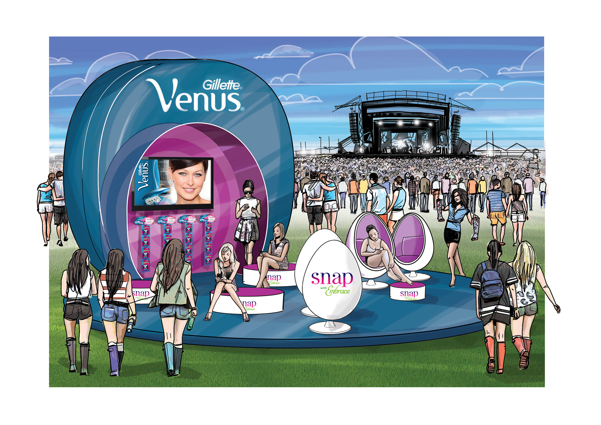 Venus Snap ‘Tell us all about your shaving horrors’, was the message at this brand activation zone. Festival goers were encouraged to take the weight off their tired party legs for a Venus pamper. They could also tweet their #shavingawks, where they could win prizes and travel shaving sets to take away. Marketing channels - Brand activation / in-store point of sale.