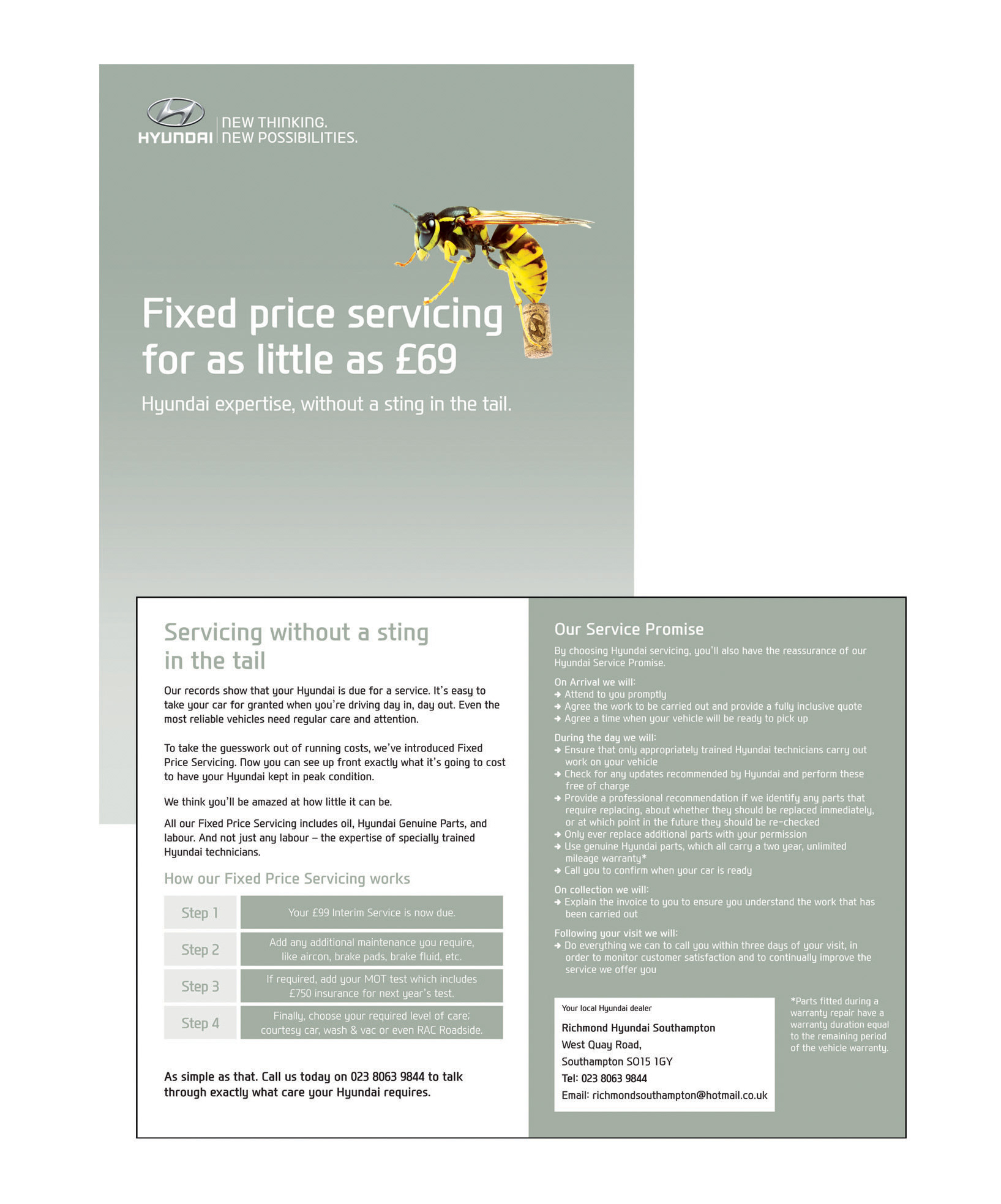 After Sales Campaign Just part of a large after sales campaign for Hyundai including dealership exhibitions and window decals. Research showed that Hyundai post-warranty servicing was perceived as expensive and often included added bills that the customer wasn't expecting. The 'No Sting' campaign resulted in a national uplift in after-sales servicing. A survey showed an increase in customer confidence and understanding of the Hyundai AS duty of care. Marketing channels - Dealership point of sale / brochures / leaflets / dealership office design.